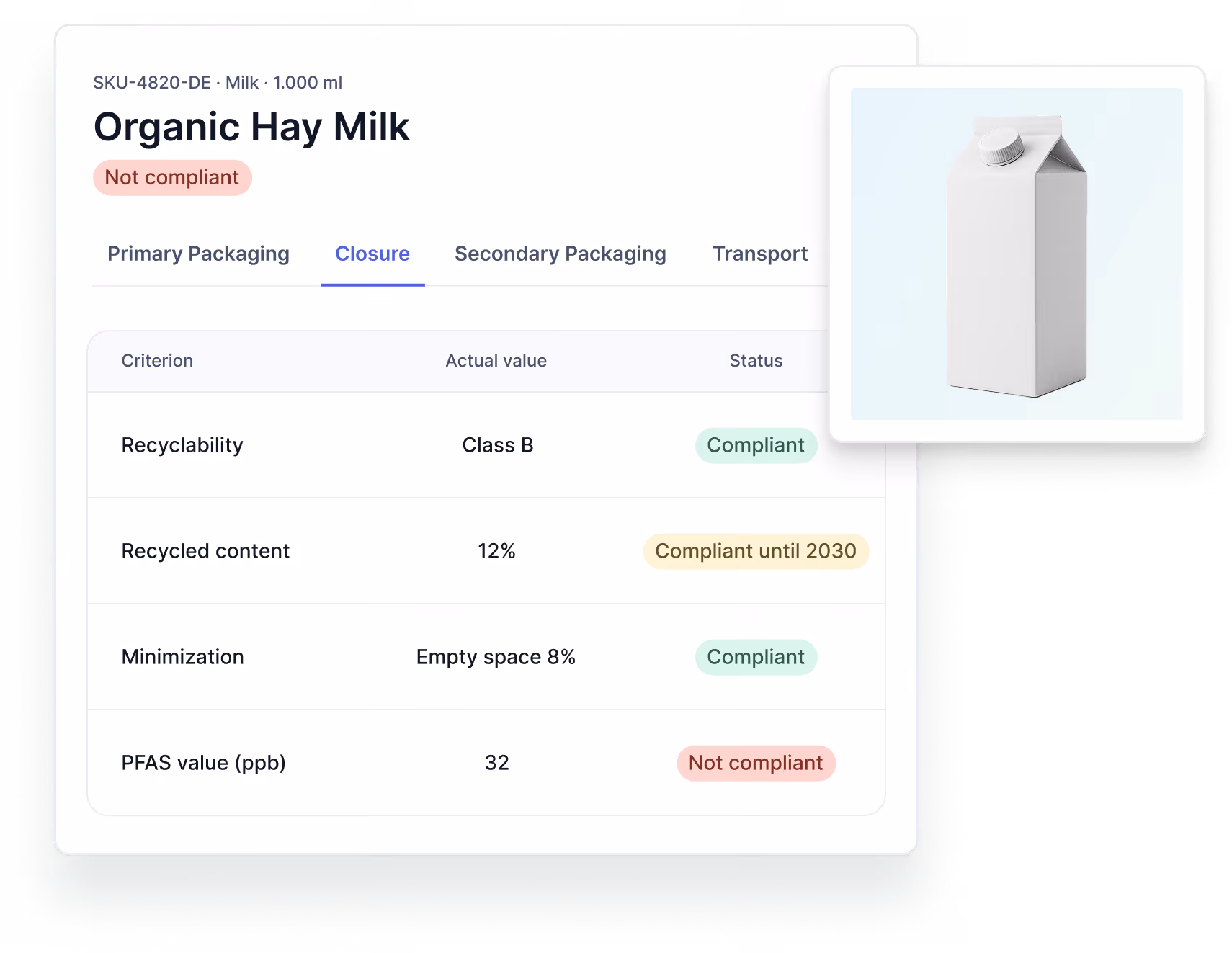 Automatically validate each packaging unit against PPWR requirements: minimization, recyclability, hazardous substances, and recycled content.
