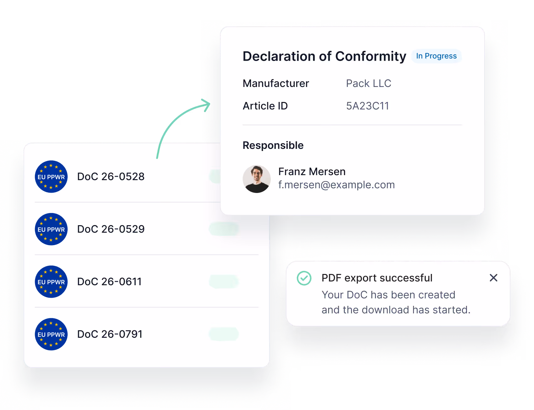 Centralize packaging data, automatically check compliance requirements, and generate Declarations of Conformity. Optimized for mid-sized manufacturing companies.