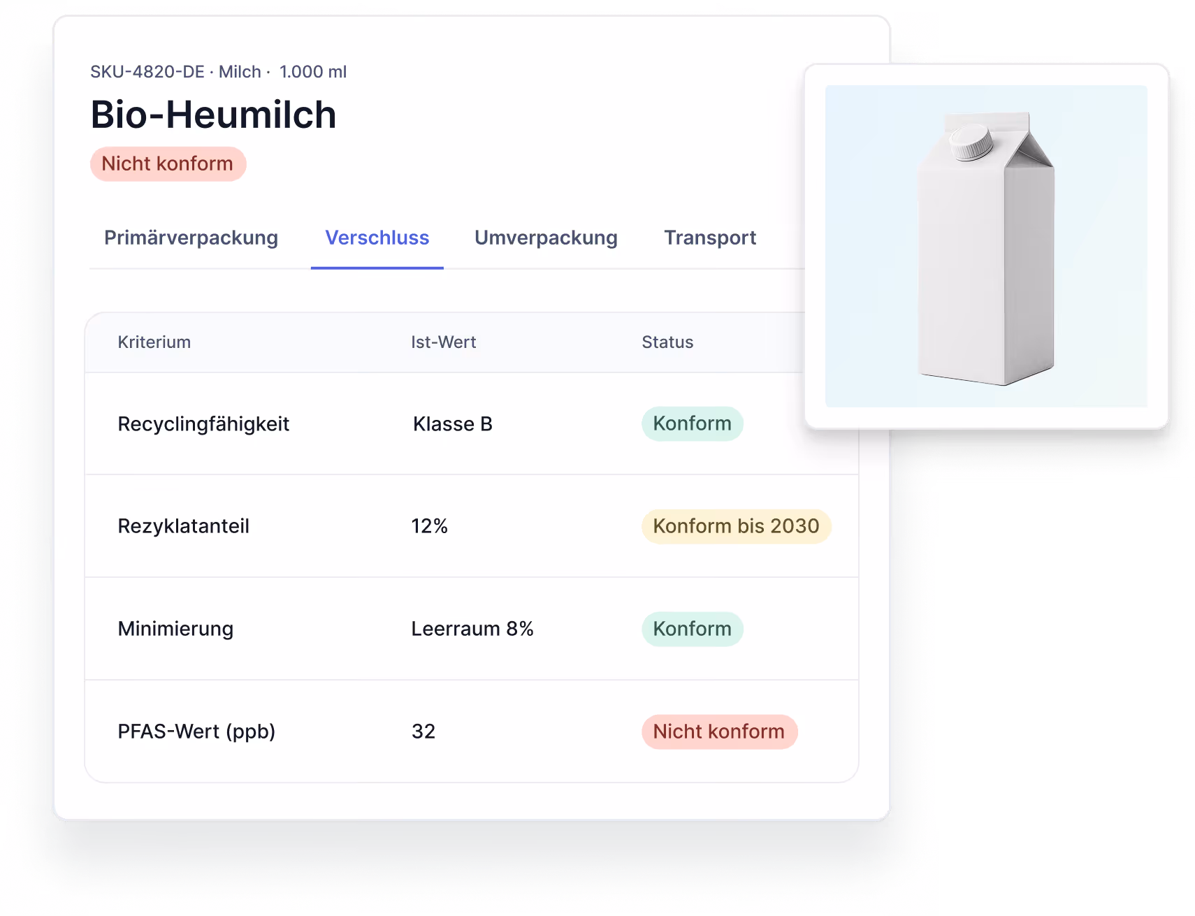 Automatischer Abgleich jeder Verpackung gegen PPWR-Anforderungen: Minimierung, Recyclingfähigkeit, Schadstoffe und Recyclinganteil.